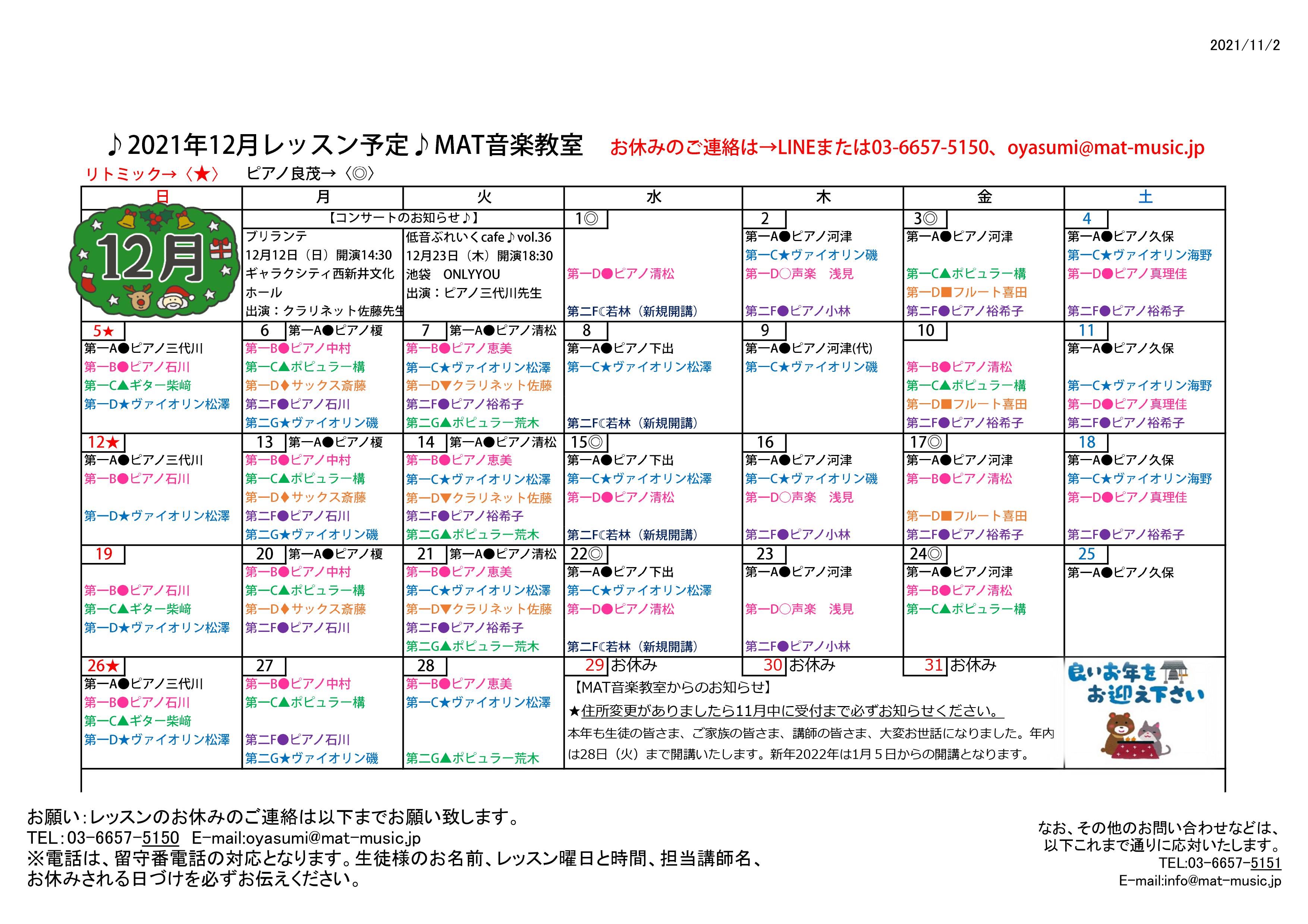 2021年12月の予定ができました♬ お知らせ 2021.11.05 こんにちは! 2021年12月の予定ができました♬ お知らせします(^^)/ ※12月以降の予定も状況によっては変更になる可能性がございます。ご了承ください。変更の場合は改めてご連絡いたします。 Custom Permalinks 初スタッフブログ 2022年1月の予定表が出来ました🎵 ホームお知らせ