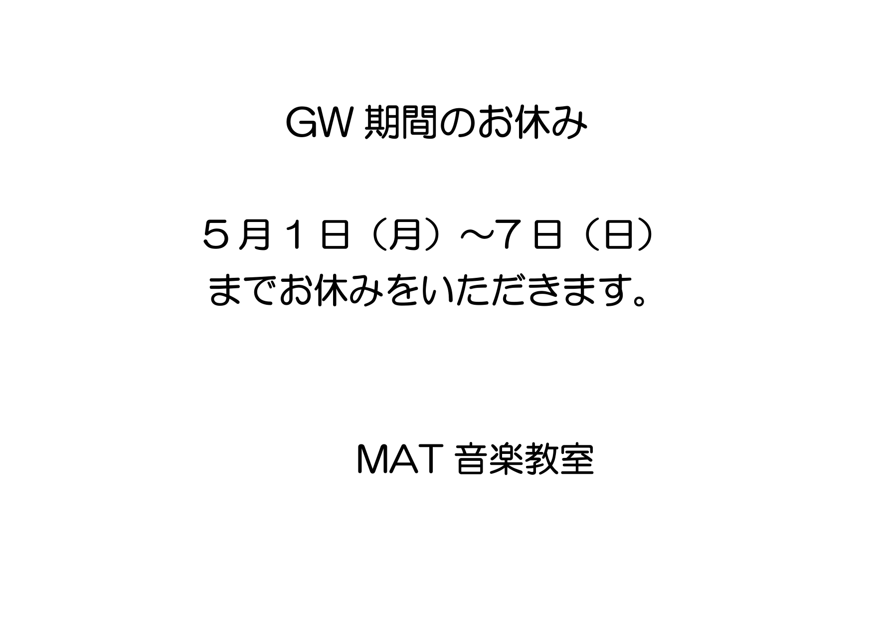 GWのお休み お知らせ 2023.04.30 MAT音楽教室は明日5月1日(月)~5月7日(日)までGWのお休みをいただきます🎶皆さま、楽しいGWをお過ごしください✨ 2023年5月の予定表が出来ました🎶 2023年6月の予定表が出来ました🎶 ホームお知らせ