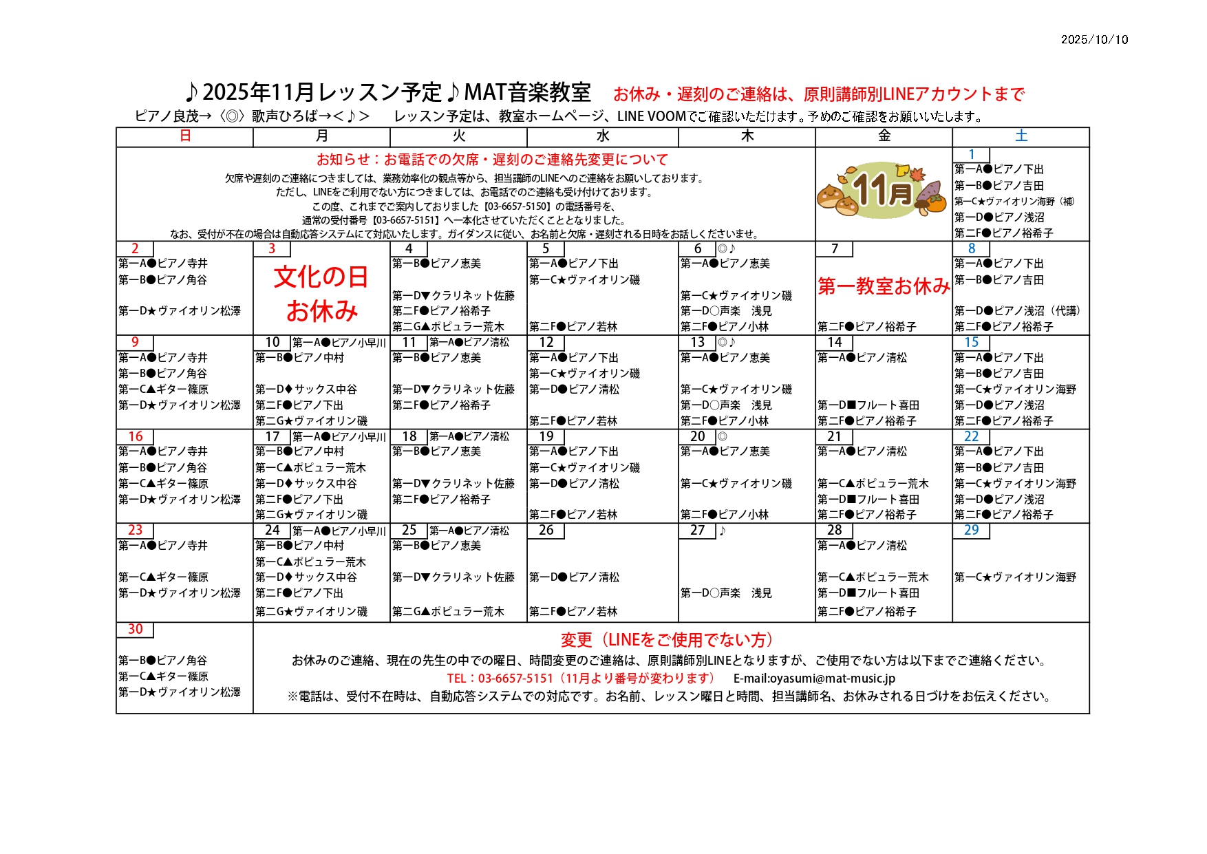 2025年11月のレッスン予定表ができました♬ mat 2025.10.10 ♪MAT音楽教室です♪教室よりお知らせが複数記載されておりますのでご確認のほどよろしくお願いします。 2025年10月のレッスン予定表ができました♬ ホームmat