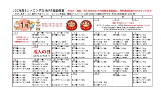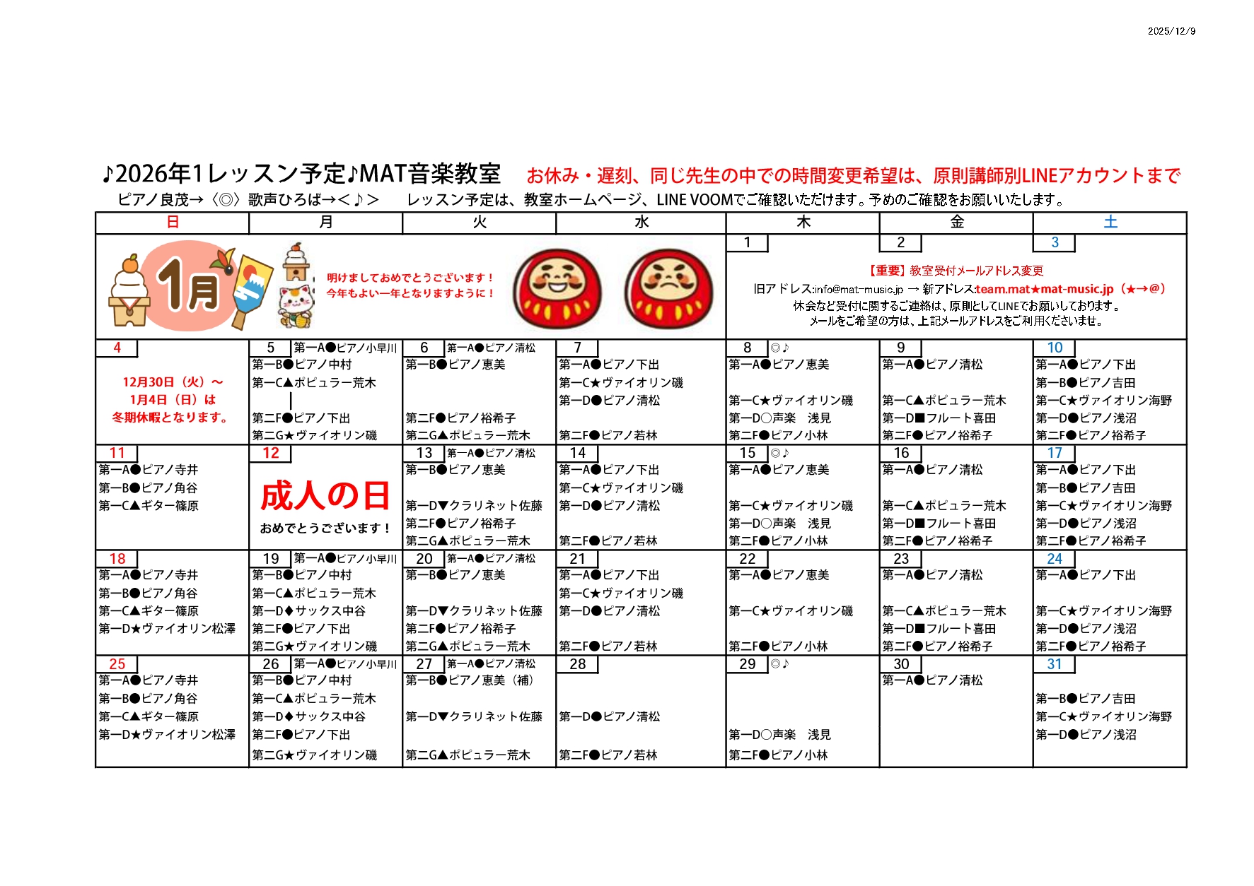 2026年1月のレッスン予定表ができました♬ mat 2025.12.09 ♪MAT音楽教室です♪少し早いですが、1月の予定表が完成しました!大切なお知らせ「受付のメールアドレス変更」が記載されておりますので、必ずご確認くださいませ。 2025年12月のレッスン予定表ができました♬ ホームmat