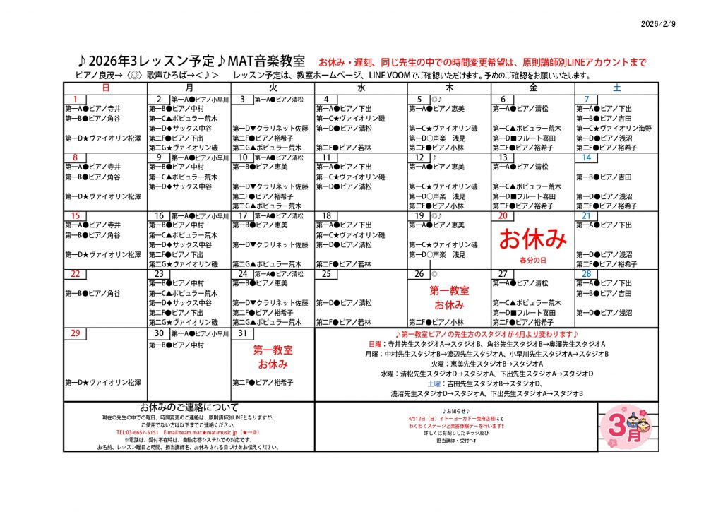 2026年3月のレッスン予定表ができました♬ mat 2026.02.09 ♪MAT音楽教室です♪3月の予定表が完成しました!大切なお知らせが記載されておりますので、必ずご確認くださいませ。 2026年2月のレッスン予定表ができました♬ ホームmat