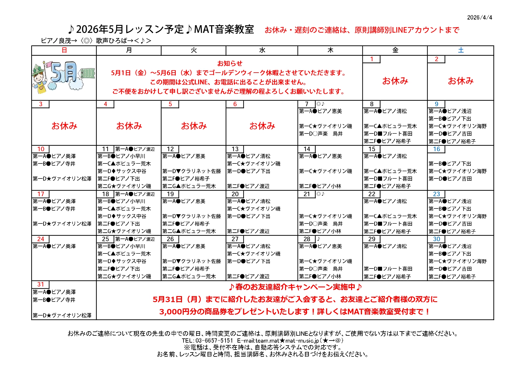 2026年5月のレッスン予定表ができました♬ mat 2026.04.08 ♪MAT音楽教室です♪5月の予定表が完成しました!大切なお知らせやキャンペーンのご案内が記載されておりますので、ご確認くださいませ。 2026年4月のレッスン予定表ができました♬ ホームmat